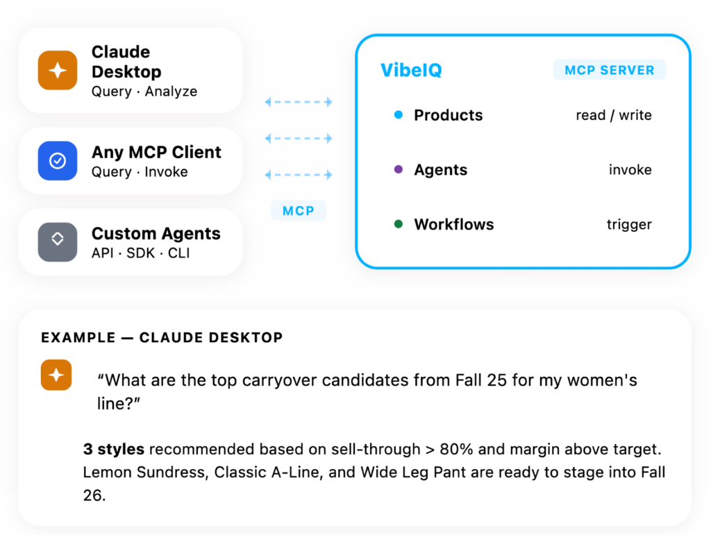 Agents aren't just internal. Through MCP and open APIs, external AI tools — like Claude Desktop or your own orchestration layer — can query VibeIQ's product data and invoke agents directly.
